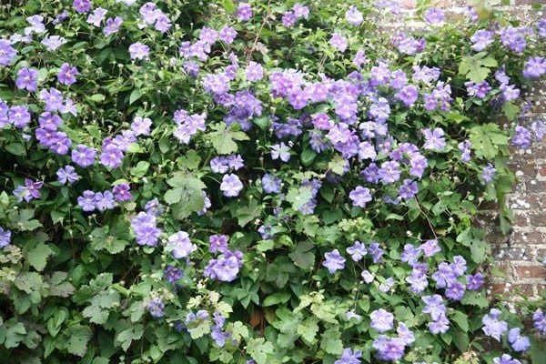 Delicate, sky blue summer flowers, pinkish-red at the base, with contrasting pale yellow centres. This vigorous, late-flowering clematis makes the perfect companion for a yellow climbing rose, such as ‘Golden Showers’. Although young plants have a tendency to wilt, they will outgrow this. Thrives in full sun or partial shade.