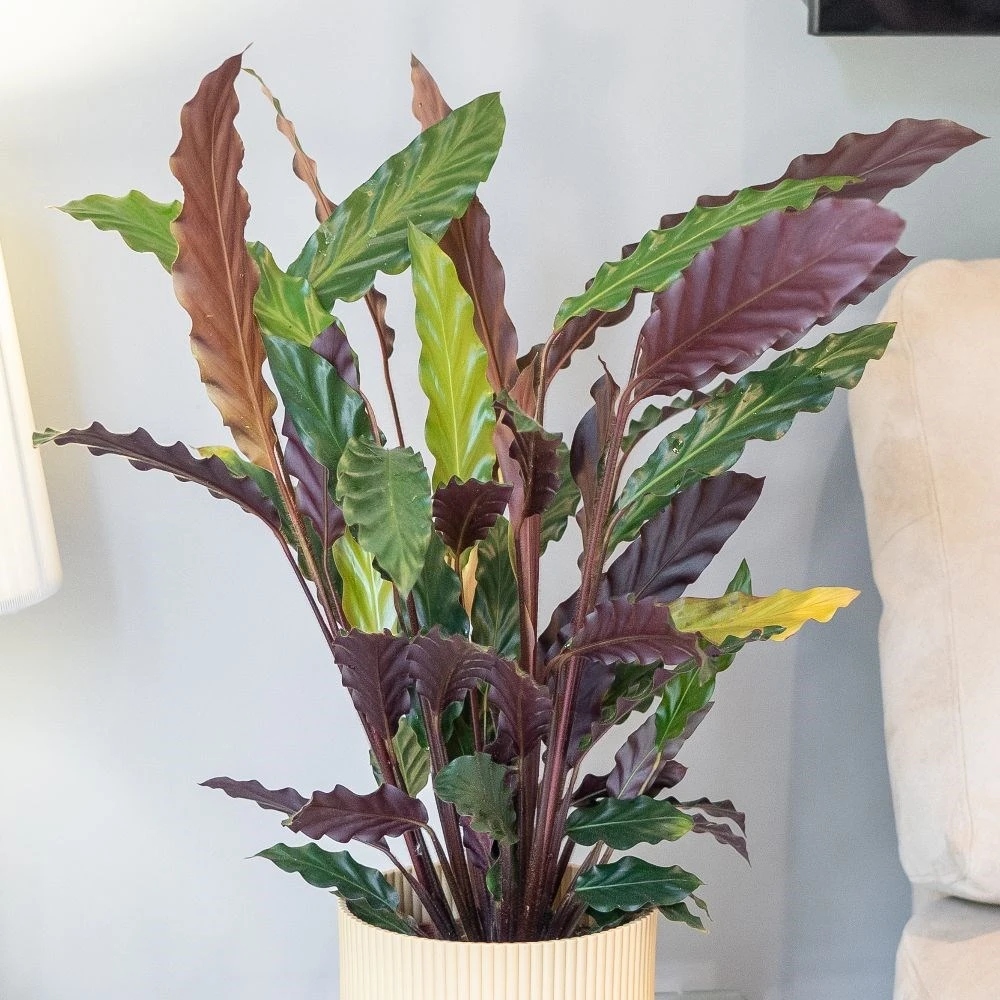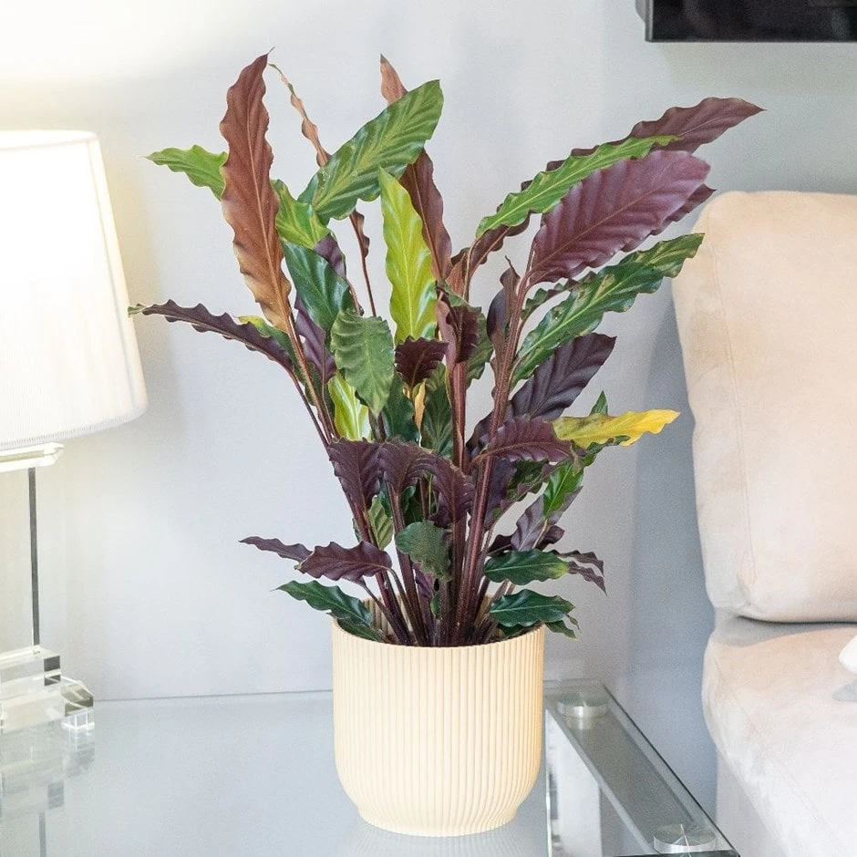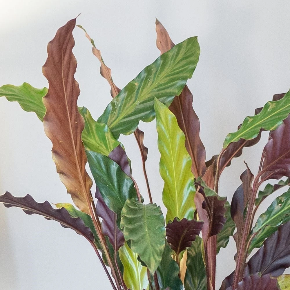 This prayer plant has narrow, glossy, dark-green, lance-shaped leaves, with velvety-maroon undersides and a charming ruffled appearance. Upright in habit, this houseplant would provide a great vertical accent and has the potential to complement many interior decor styles.