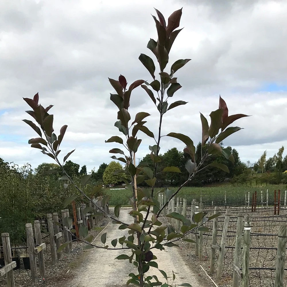 Exceptionally large, dark purple-black fruit make this self-fertile crab apple an unusual addition to the garden. The abundant pink flowers in spring contrast well against the slightly bronzed new leaves. In late summer the dark fruits ripen, developing to the size of small apples. The very dark flesh makes delicious jams, jellies and is also very good for juicing, keeping its dark colour. It is thought this variety was orignally developed for cider, but the flavoursome juice can be drunk on its own or blended with other varieties.