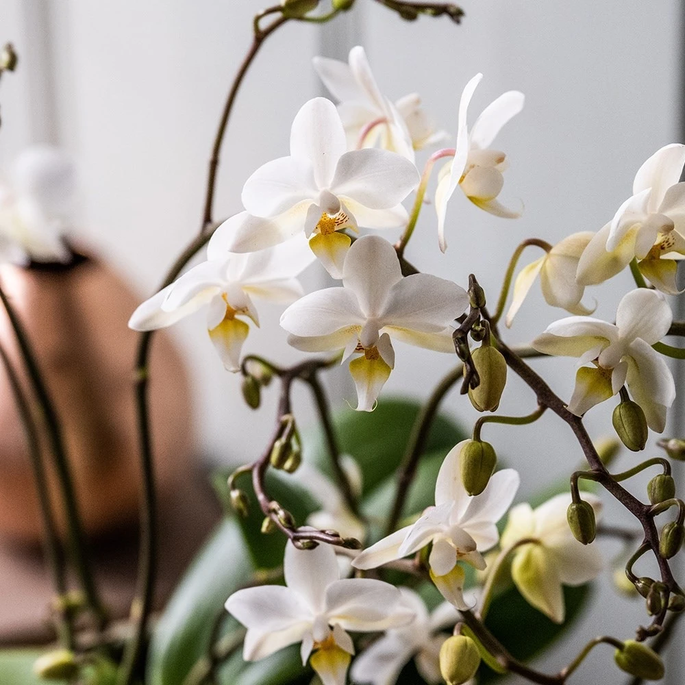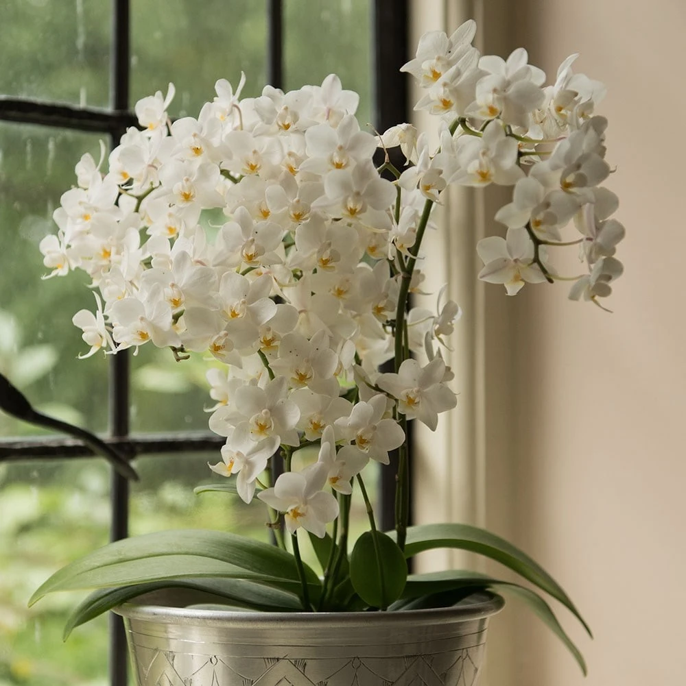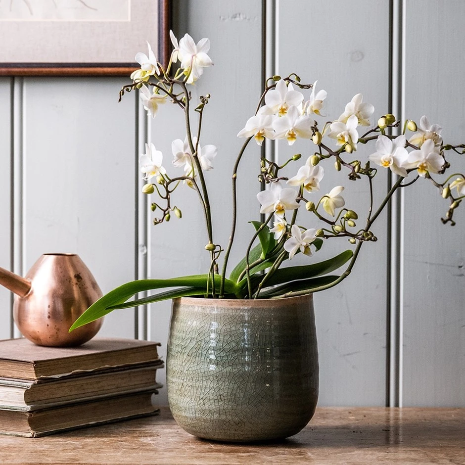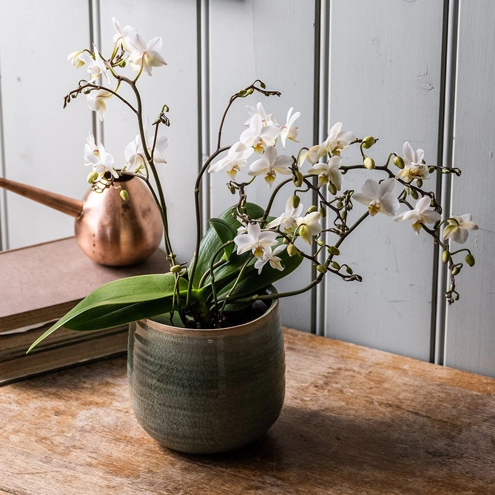 The flowers of this orchid may be small, but there are loads of them (we lost count!), so the overall effect is really impressive. What’s also impressive is the length of time the flowers last – we had one in the office last year that flowered non-stop for virtually the whole year. They are relatively easy to grow – ours did not get too much TLC, and even got neglected at times, but it still soldiered on pumping out the flowers regardless. If you give it as a gift the recipient will be thrilled! Please note that the pot in the photograph is not supplied with the plant (which is sent out in a simple nursery pot). They do however make excellent potted plants, and if you want to have a ‘finished’ look, we do have a wide range of pots on our website to choose from.