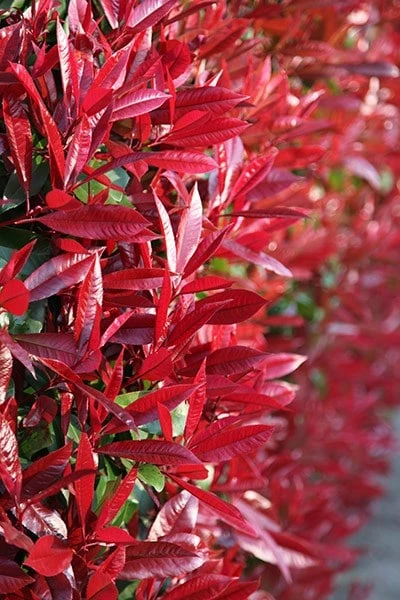 With its parrot-red, glossy young foliage, and large, rounded heads of ivory flowers, this versatile evergreen shrub is deservedly popular. It colours up best in full sun, and will usually only flower in sunny conditions, although it makes a handsome background evergreen shrub in partial shade, too. It can cope with hard pruning, so can be trimmed to form an informal hedge or clipped into strong shapes. The flowers appear in mid and late spring, and are sometimes followed by spherical red fruit. In frost-prone areas, train as a wall shrub against a south or west-facing wall.